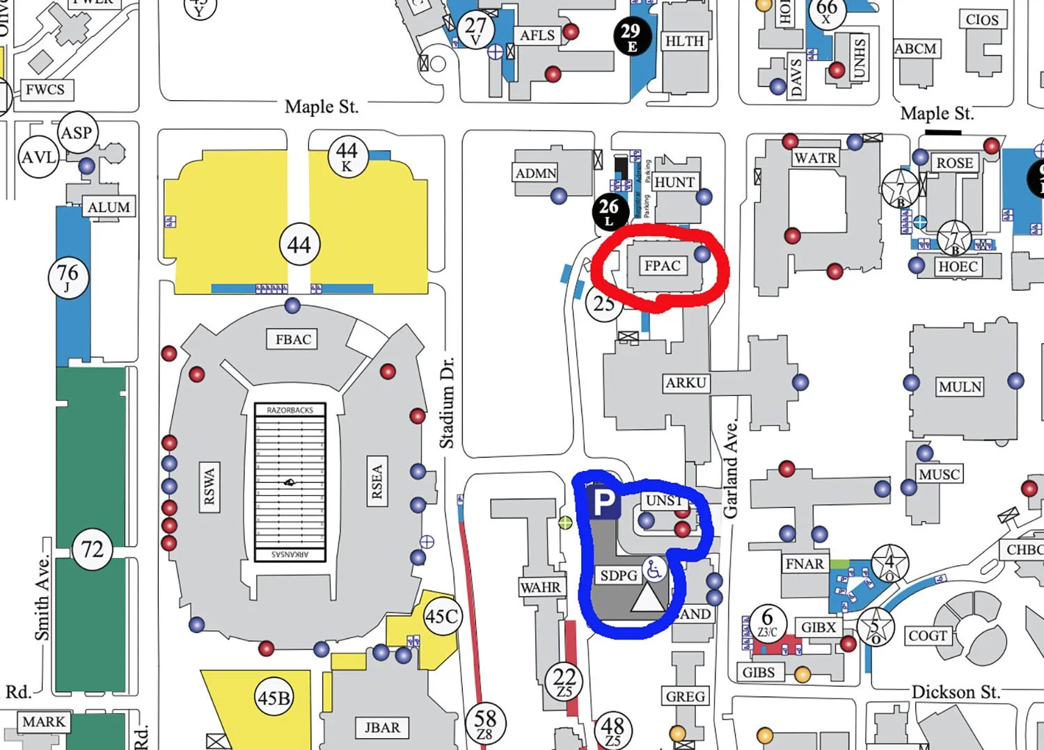 Blue Circle = Nearby parking deck. Free parking on weekends.